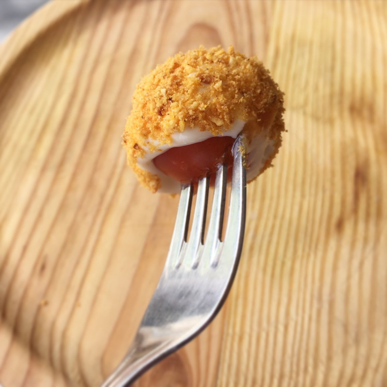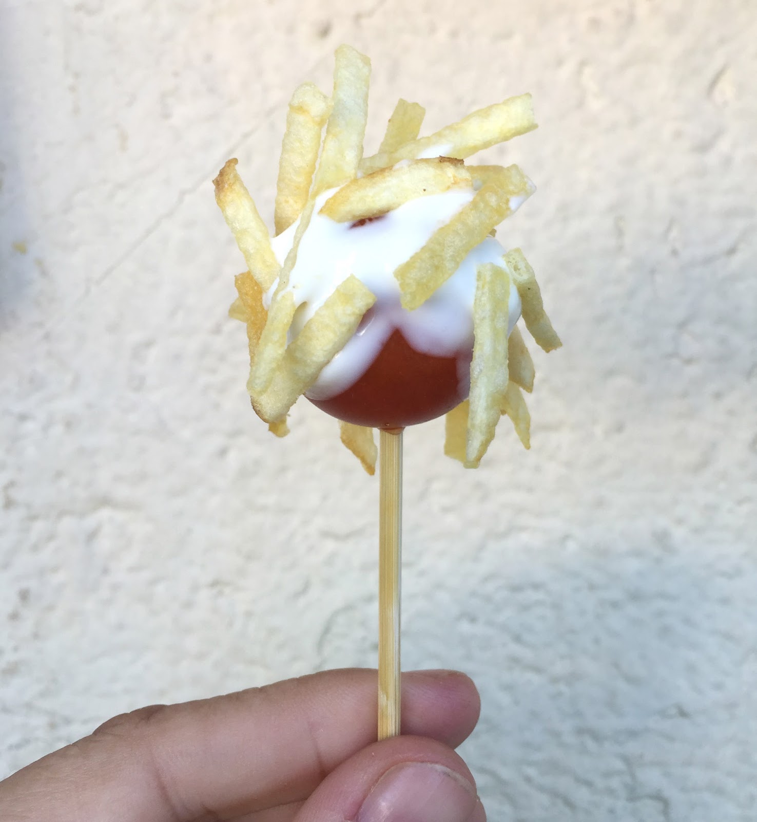 Y el funcionamiento es muy sencillo, pinchas un tomate, lo mojas en queso y para terminar lo pasa por la arena. Como resultado es un bocadito crujiente y con una combinacion de sabores deliciosa.