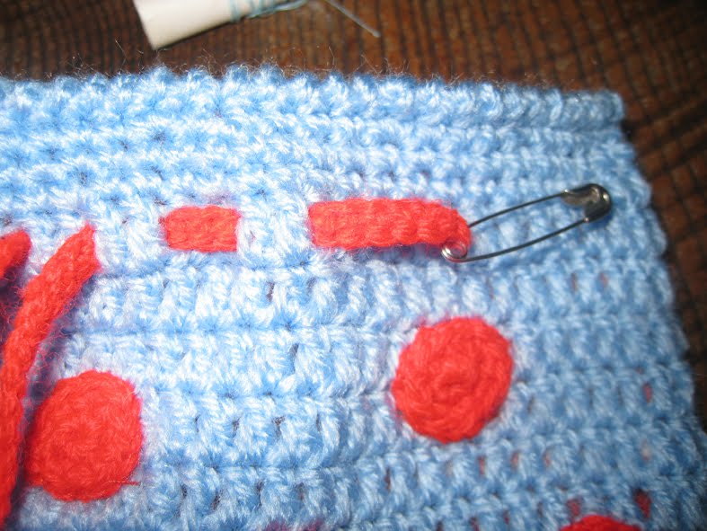 Mi versión es en azul y rojo, los colores favoritos de la niña. Pero cuando me puse a tejer, me di cuenta de que no sabía hacer bodoques y menos aún de otro color (ahora si se gracias a Lidia G. que es una profe genial!). Así que la tejí lisa y le apliqué después los puntos tejidos a parte (chapuza bastante aparente la verdad, jijiji)