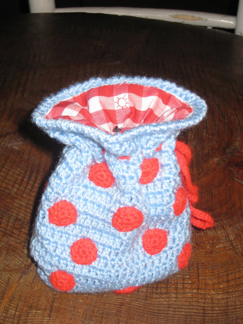Para evitar que se de de si, le he hecho un forro de tela a cuadritos y un cordón de cierre hecho con dos pasadas de cadeneta.