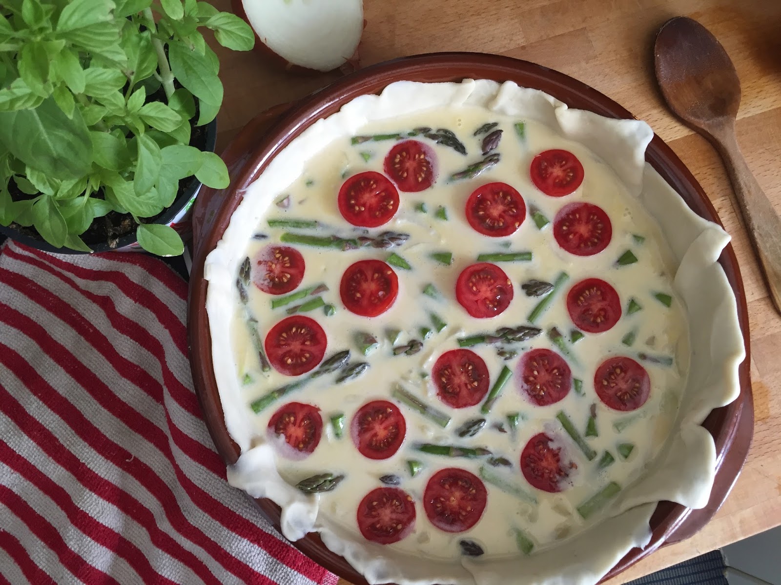 La primavera nos llena la despensa de verduras deliciosas y muy frescas de temporada. Y los espárragos son una de esas verduras que las cocines como las cocines, están deliciosas. La quiche de hoy esta hecha de cebolla, tomates cherry y espárragos verdes o espárragos trigueros.