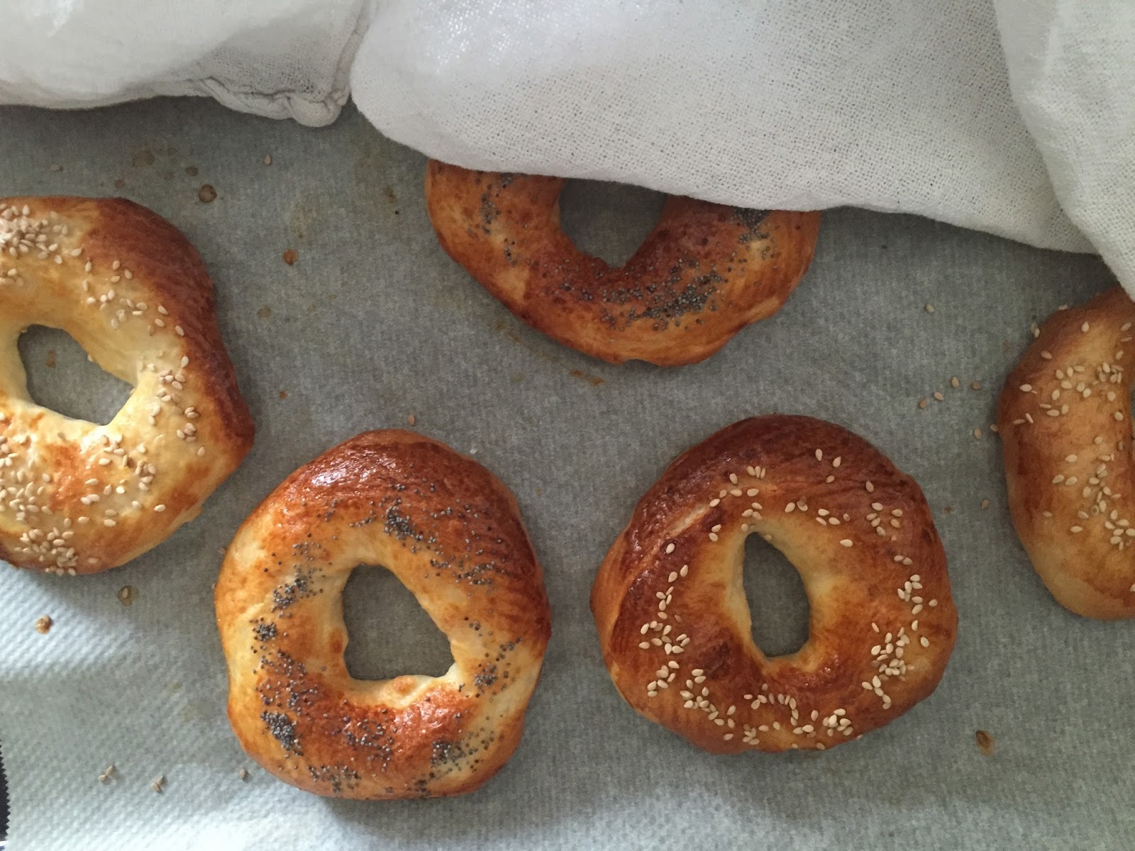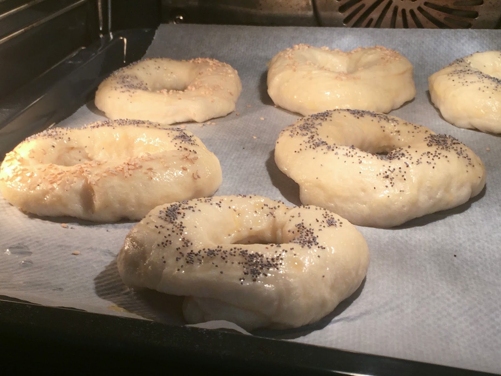 Colócalos bien separaditos porque aun crecerán un poco. Cuando empieces a estar dorados controla el tiempo para evitar que se quemen. Cuando ya estén, saca la bandeja del horno y tapa los bagels con un trapo hasta que estén fríos.