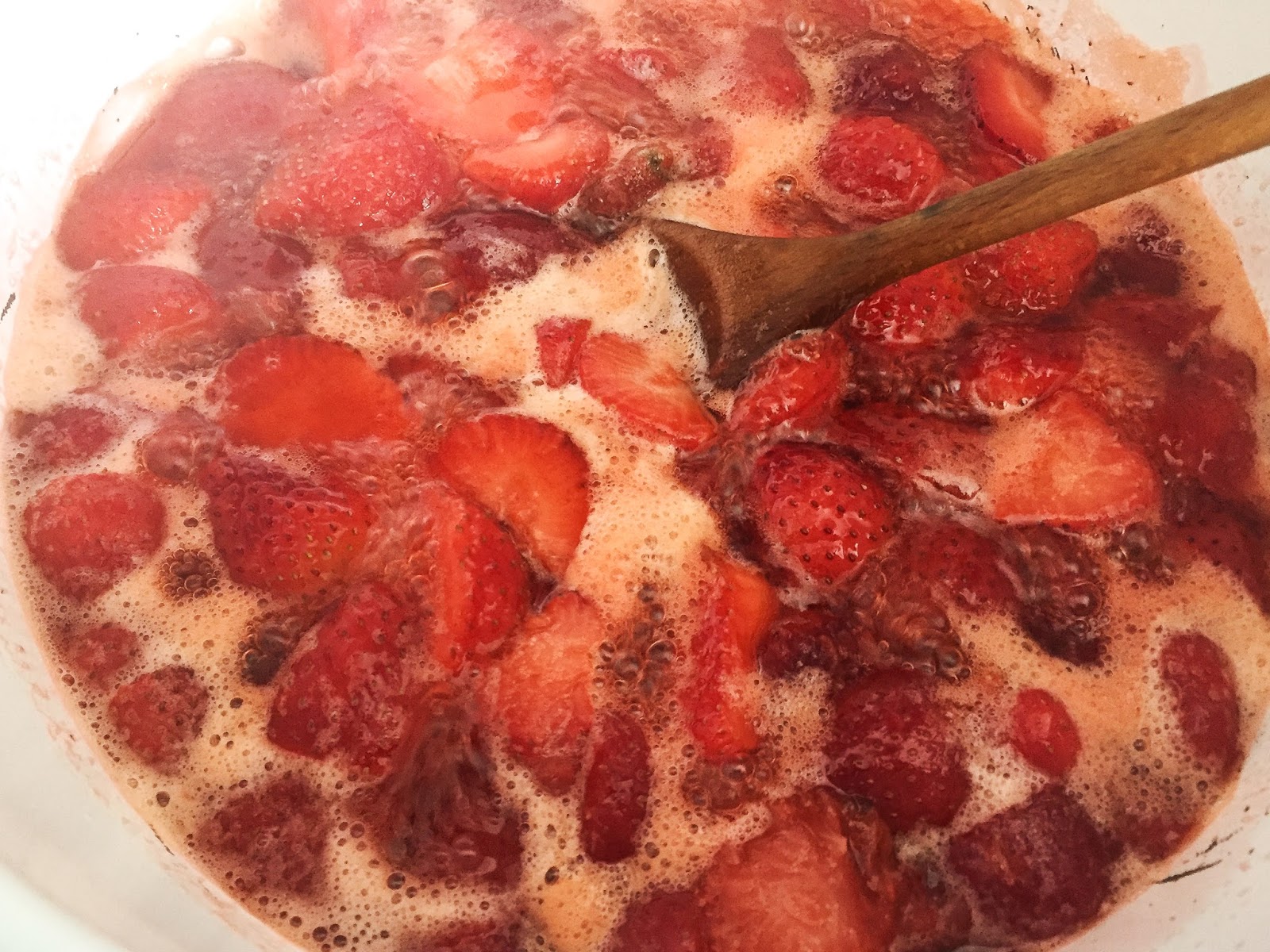 Hecha las fresas, el agua, el limón y el azúcar en una olla a fuego lento y deja hervir al menos 15 minutos, hasta que las fresas se deshagan con solo remover. Retira del fuego y bate un poco con la batidora. Si he quedado muy liquido, no te preocupes que con el agar agar lo vamos a espesar un poco. Coloca de nuevo al fuego y cuando empiece a hervir, añade el agar agar espolvoreando por encima. Deja hervir un minuto más y retira del fuego para enfriar.