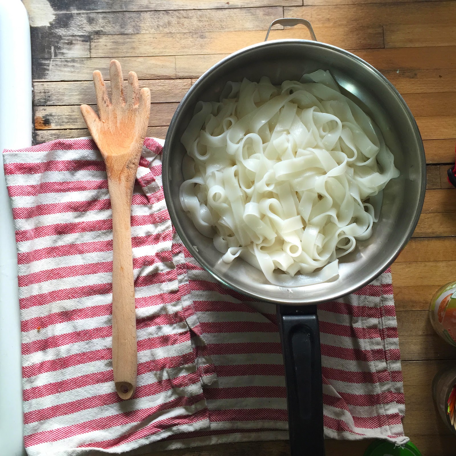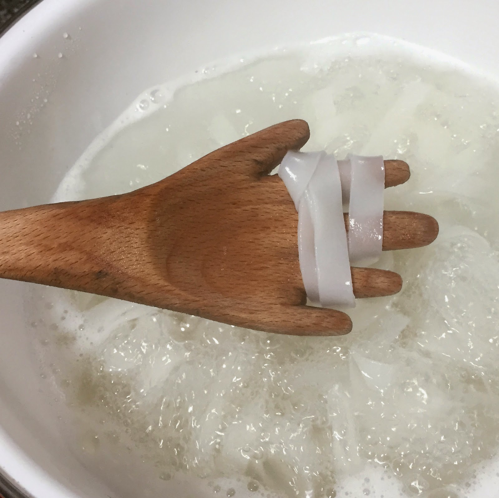 Así que misterio resuelto, quería una cuchara de madera con forma de mano para mover mejor la pasta cuando se cuecen. Y para demostrarlo, nos hizo unos tallarines de arroz con aceite y ajo de rechupete.
