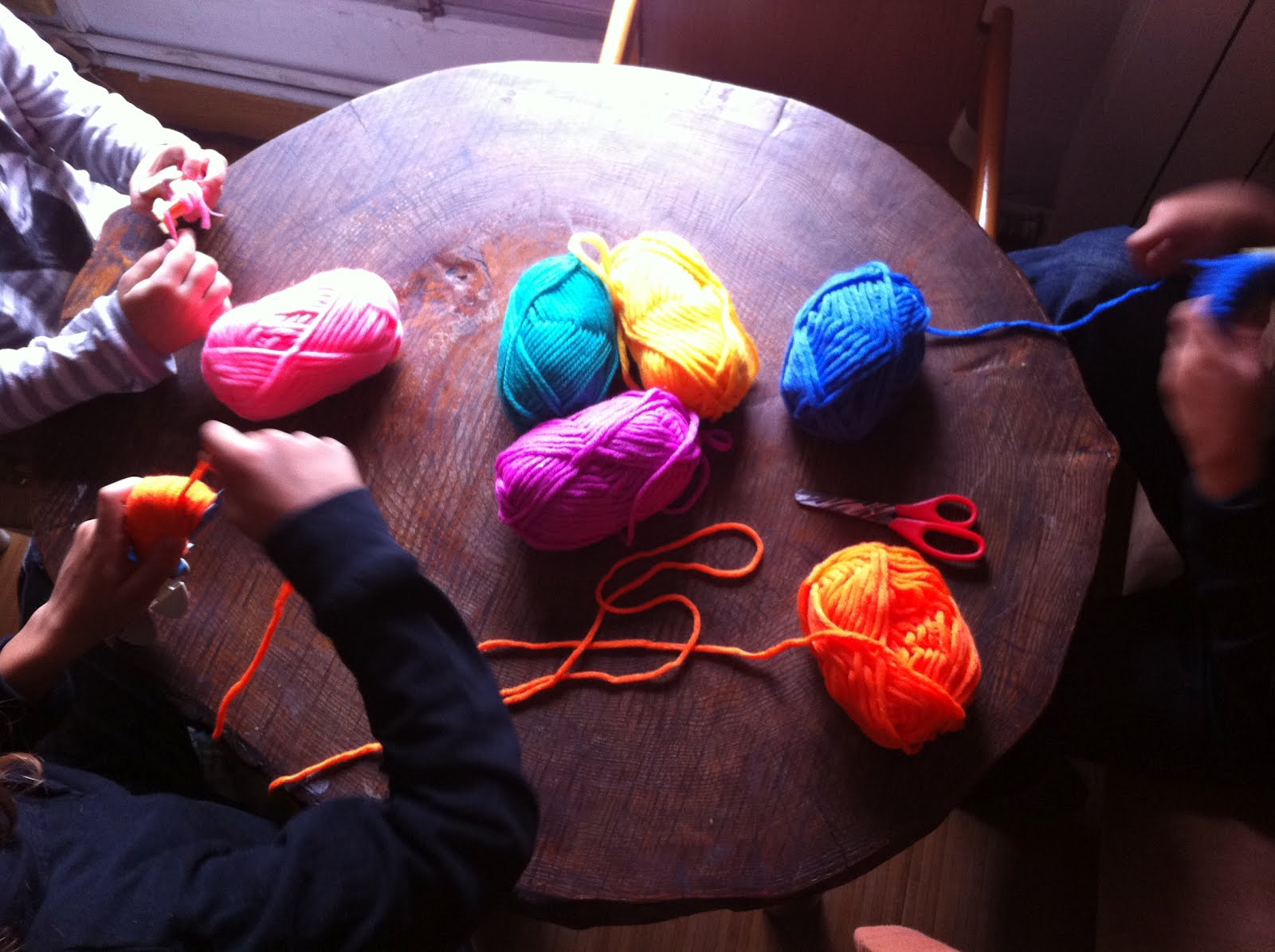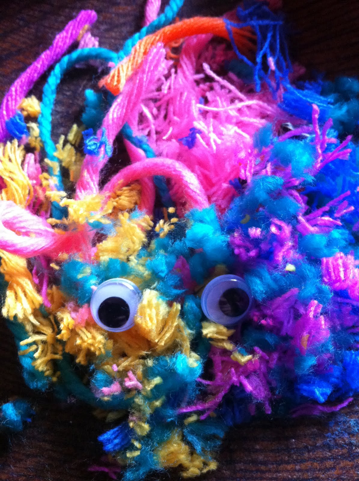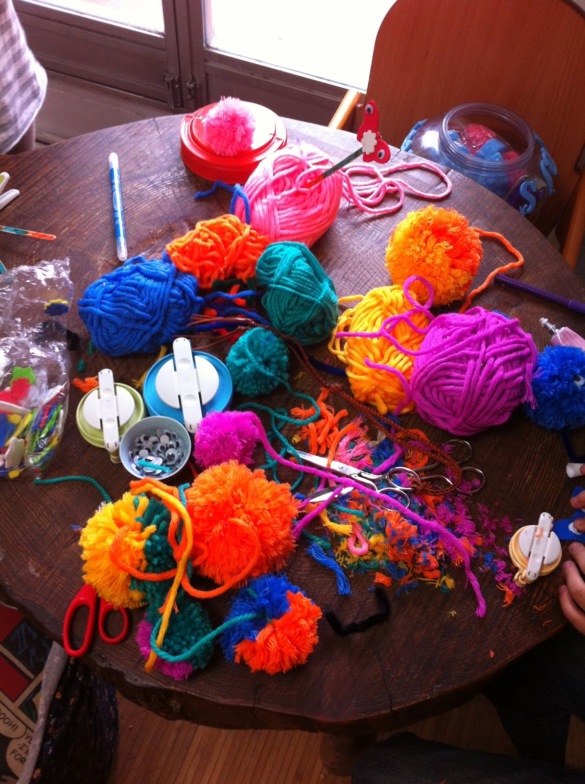 Así que saque las lanas fluor que compre en un mercadillo de pueblo estas navidades y los moldes nuevos para hacer pompones de Clover. Y resulto ser un día maravilloso, casi nevando en el exterior, con la música a todo meter, cantando a gritos y haciendo monstruos.