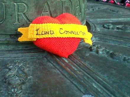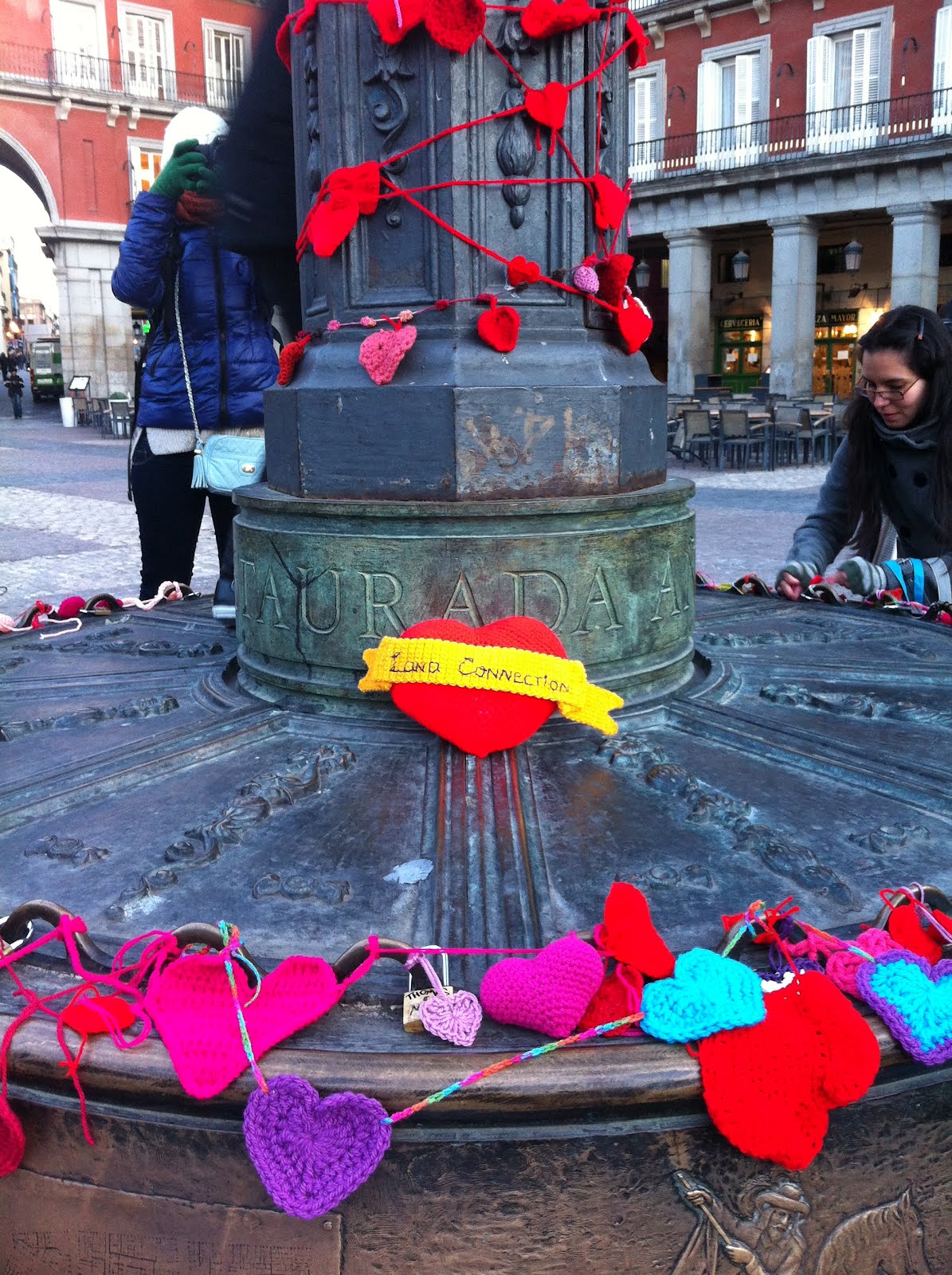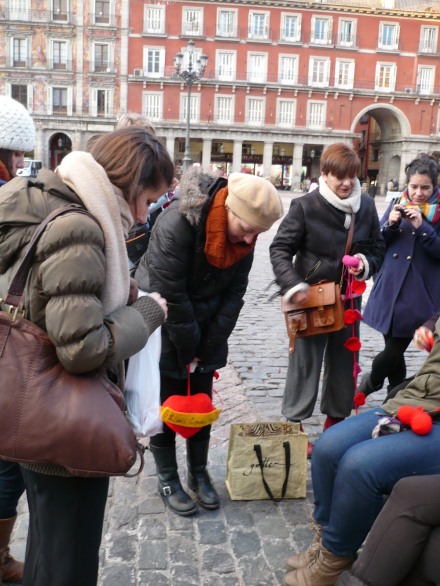 La lana toma la plaza. La segunda intervención de Lana Connection en Madrid lleno la noche de San Valentín la ciudad lana, de amor y de parejas regalando nuestros corazones a sus amados. Después de lo poco que nos duró la mantita colocada en la intervención anterior, lo teníamos muy claro. Esta acción debía ser para llevar, para hacer partícipe a la gente. Fue increíble ver como la gente se acercaba a mirara y se iban con un corazón entre las manos, para dárselo a sus amados, una niña nos pidió uno para regalárselo a su papá (que la traía del cole) y una pareja de octogenarios se besó delante de nuestras cámaras en señal de agradecimiento.