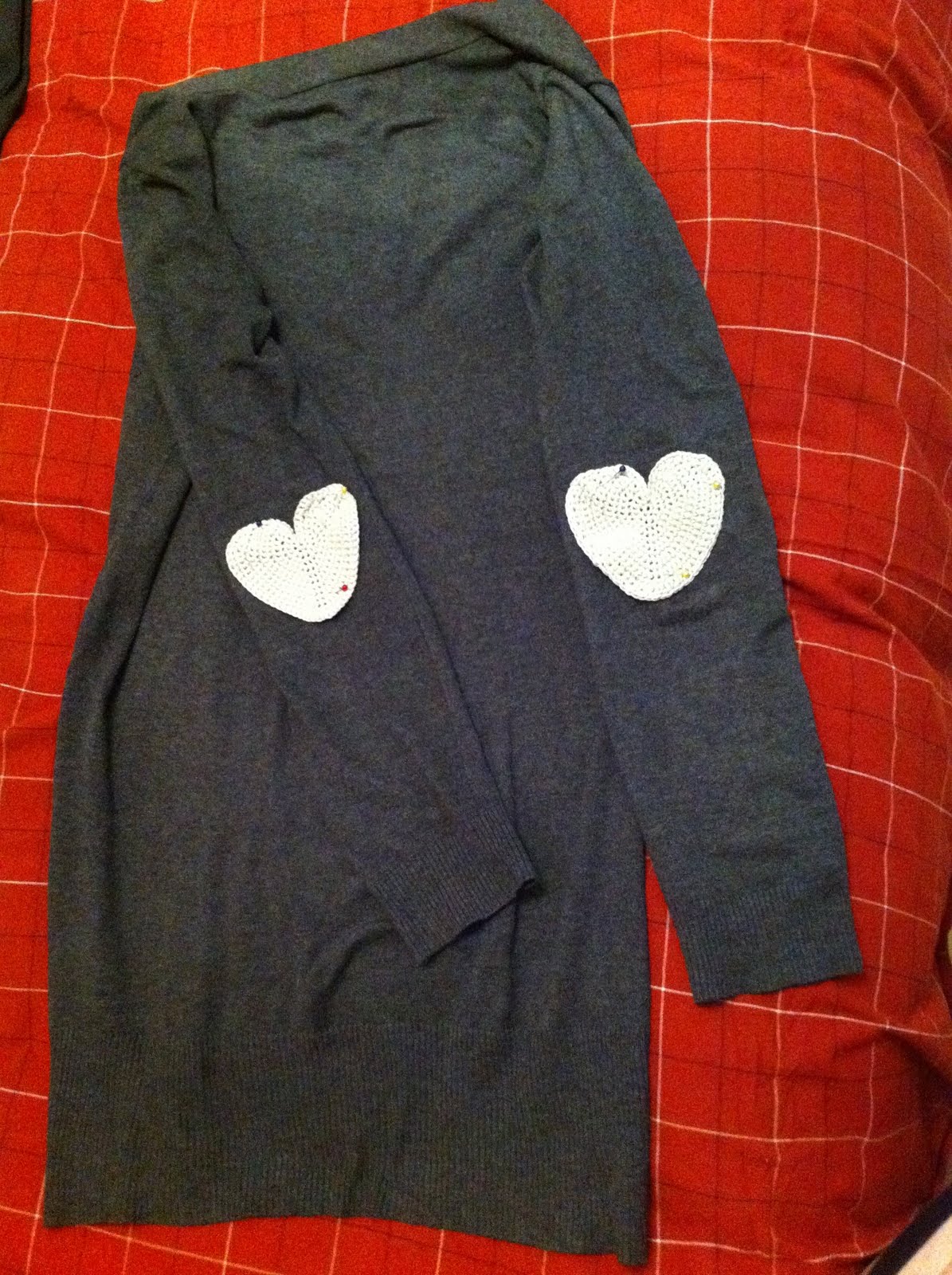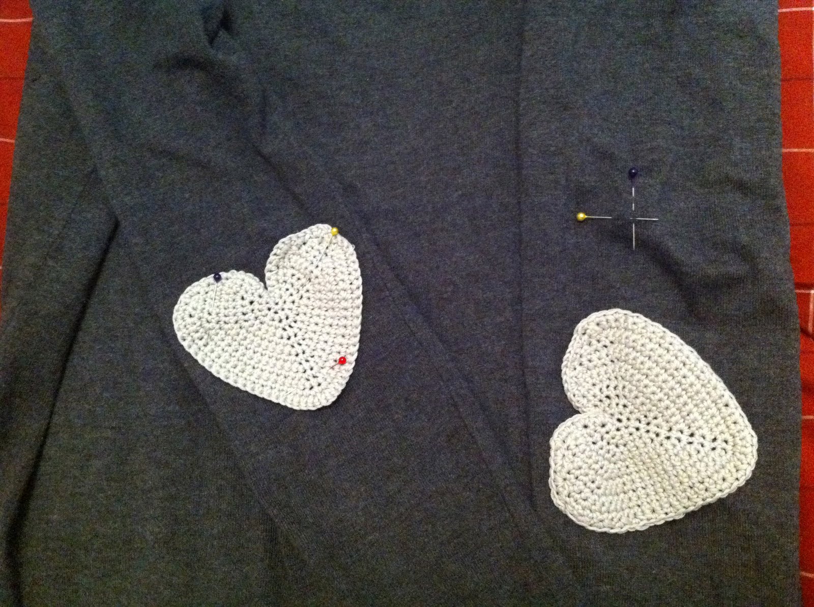 Una vez terminados los dos corazones, procedemos a colocarlos en el codo de la chaqueta o jersey.