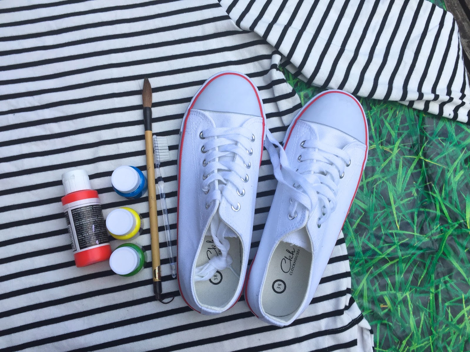 Mientras se secaba, y como me había sobrado mucha pintura, recordé unas zapatillas sencillas que compré hace tiempo y que no había estrenado, y no me pude resistir. La técnica es igual, solo que te recomiendo quitarle los cordones antes a las zapatillas y dejarlas secar mucho antes de usarlas, ya que la tela de las zapas no se puede planchar como la de la ropa para que la pintura se fije bien.