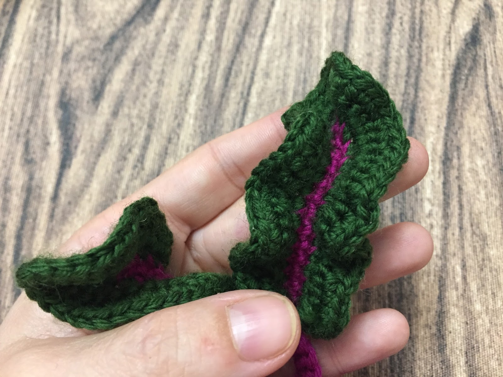 Teje dos o tres hojas y cóselas a la parte de arriba de la remolacha y ya tienes lista tu remolacha.
