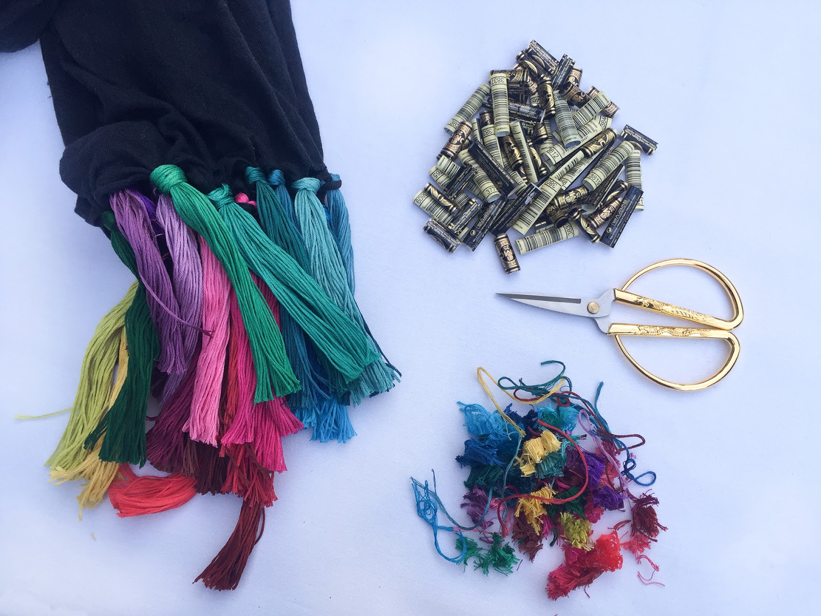 La primera es un chal con flecos multicolores hechos con las madejitas de Mouline. Tan solo se necesita para hacerlo una pieza de muselina de 2 metros de largo por 8 de ancho. Yo elegí una que tenia negra teñida a mano hace tiempo, pero también podéis usar una pieza de algodón, de lana fina o incluso de seda.