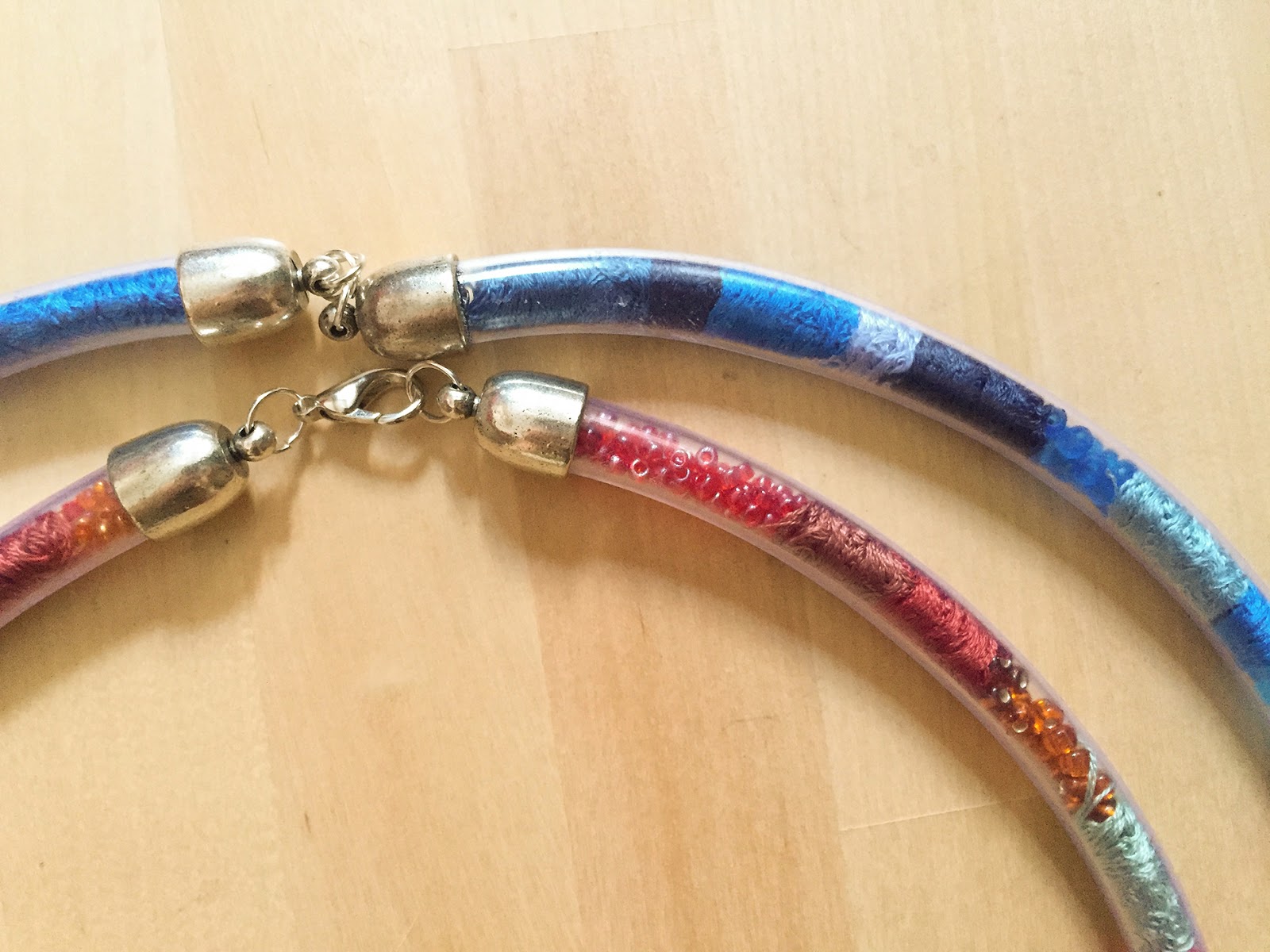 El segundo reto fue hacer unos collares muy locos de inspiración africana. Usando tubo de plástico (de ese que se usa los acuarios), cuentas de colores, lentejuelas e hilos de colores. Introducir alternando cuentas y pequeñas porciones de hilo se pueden conseguir efectos muy divertidos. Las lentejuelas proporcionan brillo y un toque mas futurista.