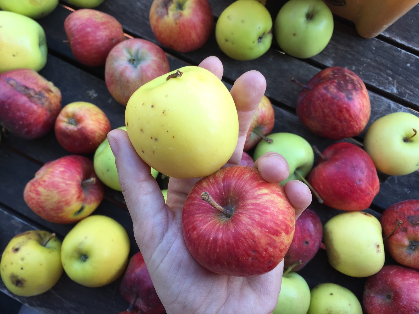 Las manzanas que yo uso todo el invierno son las de los arboles del pueblo, manzanas Golden y Braeburn. Como los nuestro jardín es ecológico, no usamos pesticidas, así que hay años con mala cosecha y manzanas pequeñas y otros, como este, con muchas y de tamaño mediano.