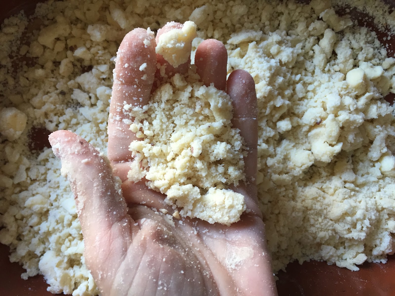 Y amasamos con las manos hasta obtener una arenilla suelta. Esta es la parte mas divertida para hacer con los niños (el güarreo siempre les gusta). Se puede añadir azúcar o más harina si vemos que queda muy húmeda la arena.