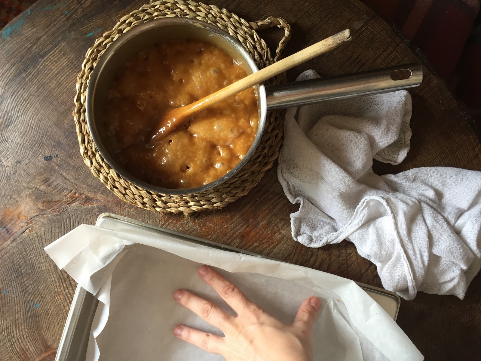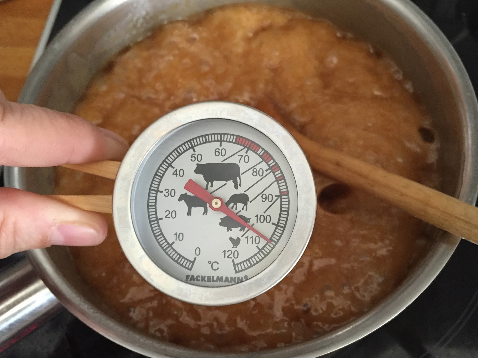 Debemos remover de vez en cuando y comprobar que la temperatura no sube mas de 120º porque si no el azúcar se precipita de nuevo cuando se enfríe y queda grumoso. Cuando la espuma del toffee empiece a clarear, apagamos el fuego y con mucho cuidado lo vertemos sobre un molde engrasado o con papel de hornear.