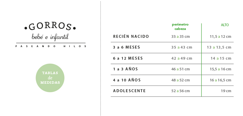 Esta tabla de medidas contiene la medida del perímetro de la cabeza y la altura del gorro por edades.