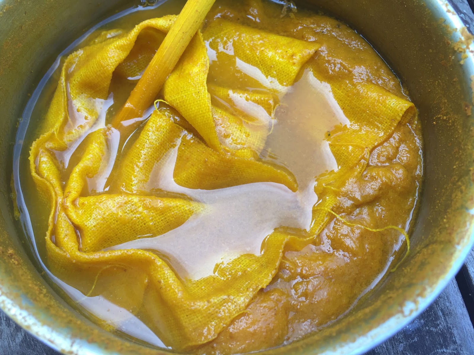 Y como sabía que al ser naturales no me durarían mucho en la nevera, aproveché para teñir muestras de tejido y así guardarlas como referencia para futuros teñidos. Las cantidades de verdura, de agua y de tintura no son importantes en mi experimento porque varían de una tintada a otra (no os las toméis como referencia porque son solo mis chapucillas) por la olla donde se cocieron y por el tamaño de mi cocina.