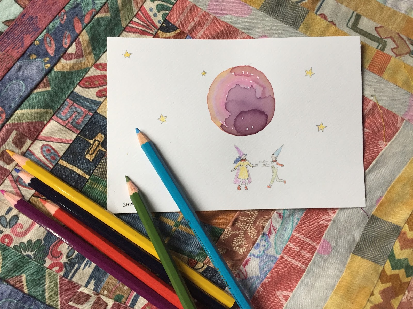 Hicimos muchas aguadas y manchas de colores y sobre ellas luego yo dibujo las hadas que me piden los niños. Este duende que cabalga hojas en otoño me lo pidió el pequeño que esta obsesionado con los caballos. Las hadas que recogen flores son para mi hija, y las que bailan a la luz de la luna de lombarda son mías.