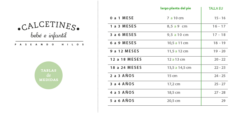 Esta tabla de medidas contiene la medida de la planta del pie y la talla aproximada por edades.