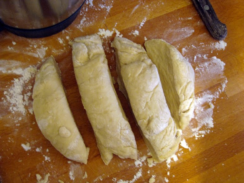 Posteriormente se corta la masa en cuatro trozos para poder manejarla con mas facilidad. Ahora empieza el proceso de amasado fino.