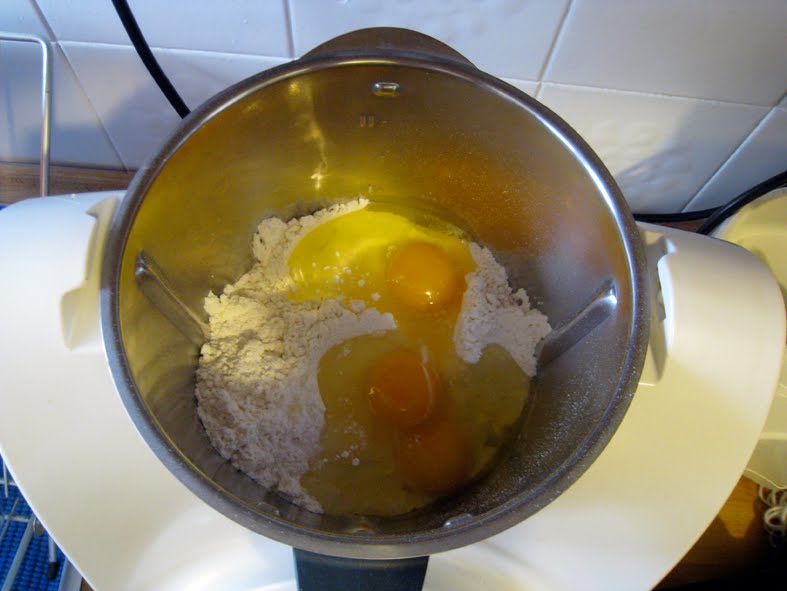 Se mezcla todo en la amasadora o se hace a mano colocando los ingredientes en un bol. Se aplastan los huevos con un tenedor hasta que se liguen con la harina. Se amasa hasta obtener una bola de pasta homogénea.