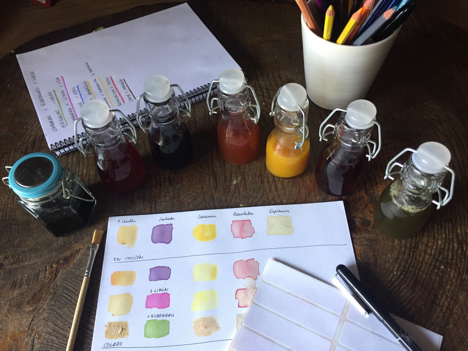 Siguiendo las instrucciones de Jo del blog Jo’s Loft, la materia prima de los pigmentos son la remolacha, la lombarda, la cascara de cebolla, la cúrcuma y las espinacas (estas ultimas un fracaso absoluto ya que no tiene excesivo pigmento o no supe sacárselo). La obtención de los pigmentos es con una simple cocción de los vegetales. Una vez colados apartamos unas botellitas de acuarelas de colores intensos y brillantes que me sorprendieron mucho la verdad.